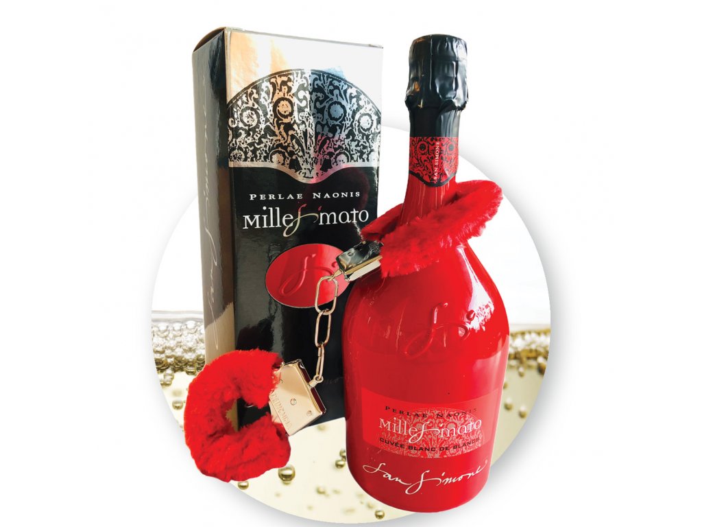 Překvapte svou drahou polovičkou rafinovaným dárkem s plyšovými pouty a lahví výborného šumivého vína.