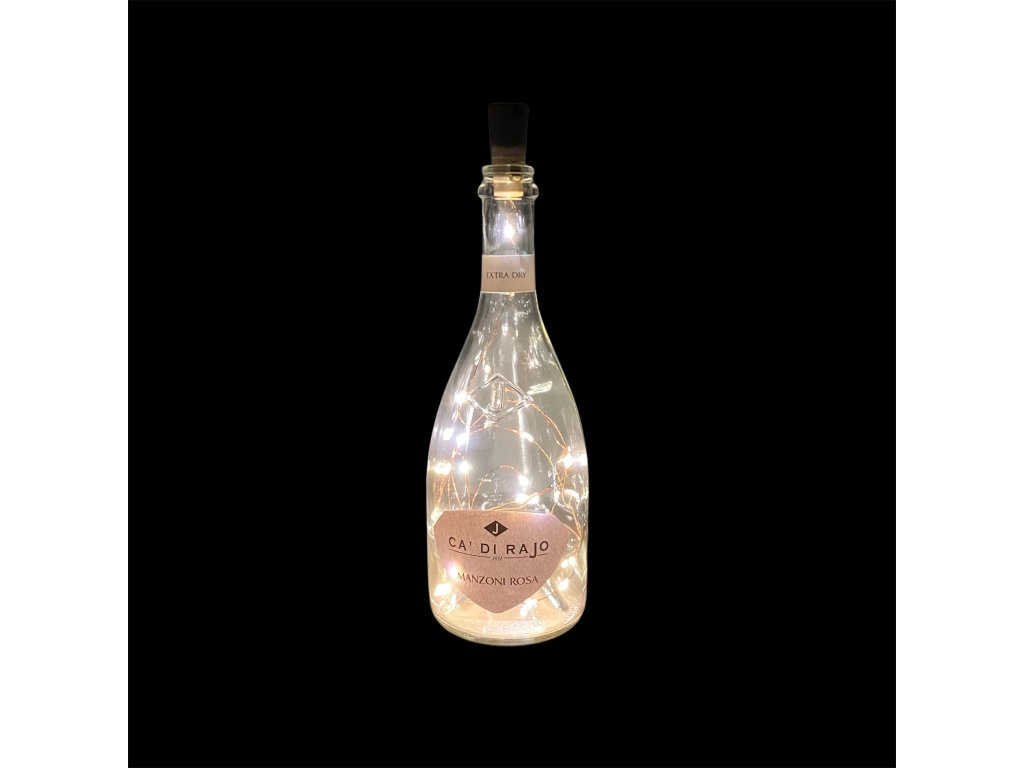 Světelný LED řetěz ve skleněné lahvi ve formě imitace zátky vína.